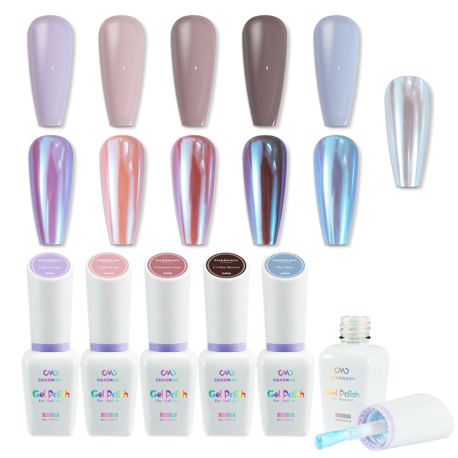 - What You Will Receive: CHARMACY winter gel nail polish set contains 5*8ml gel nail polish in different charming colors such as Black, Blue, Green, Medium Gray, Wine Red, and 1*8ml mirror, color-changing chrome nail polish.